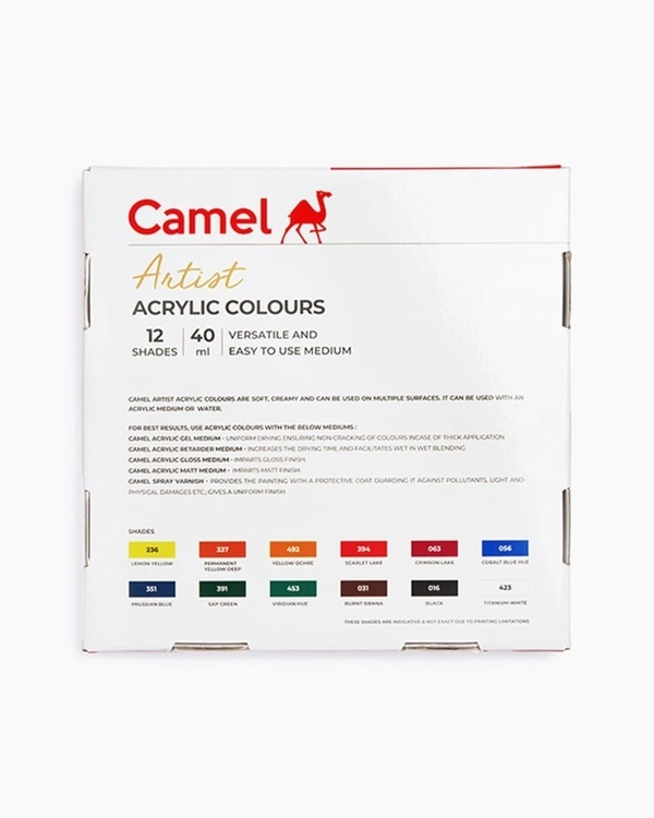 Camel Artist Acrylic Colours Assorted pack of 12 shades in 40 ml with Mediums